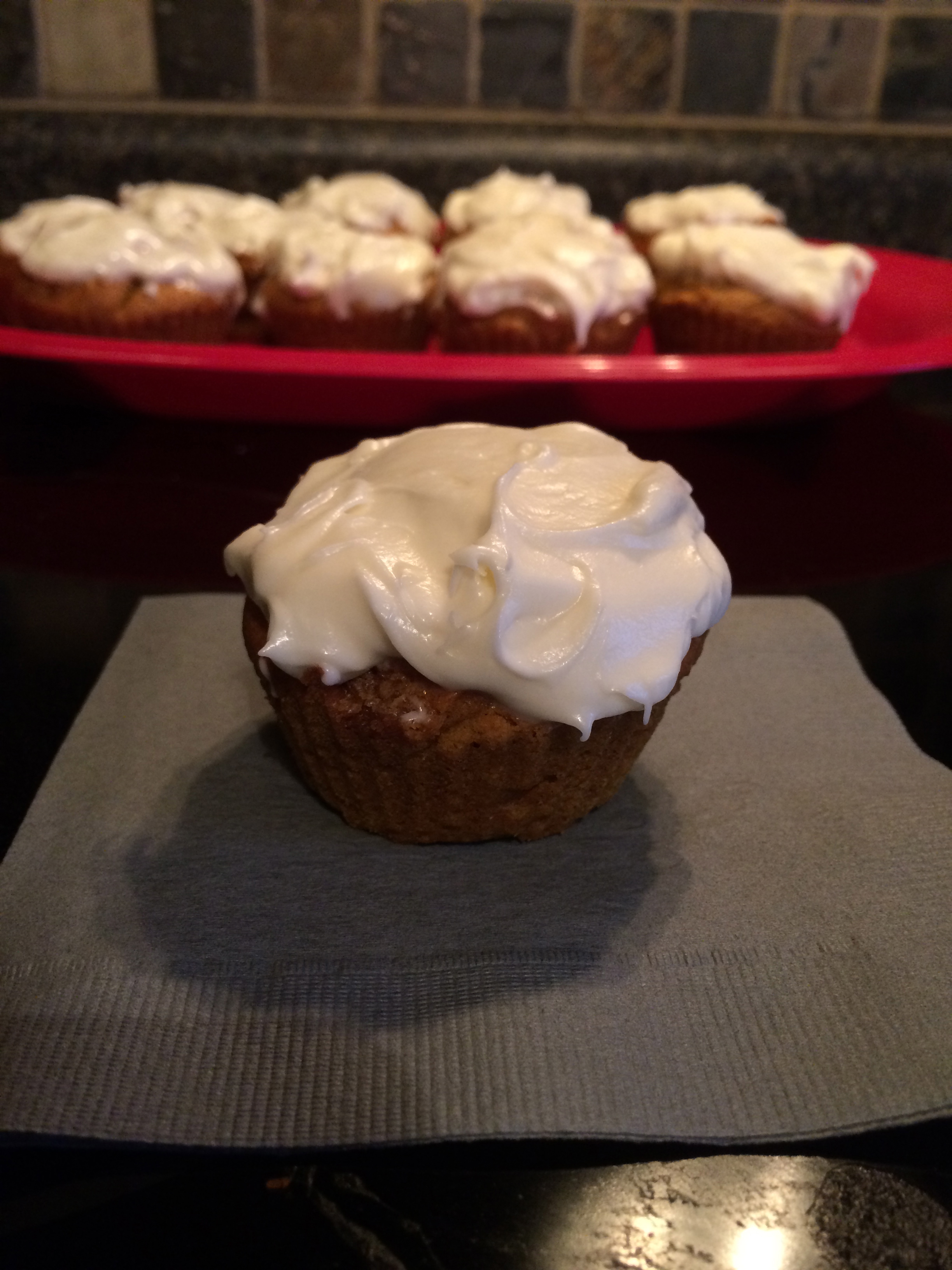 Around Christmas time I had bought stuff to make pumpkin pies at my mom’s house for our Christmas Eve dinner. Well my parents live about 2 hours away and when I left I forgot the pumpkin pie stuff! When we came home after Christmas I had all this pumpkin and we don’t even like pumpkin pie! So the search began for something I could use the pumpkin stuff for that we might actually eat. These cupcakes are it. They have actual pumpkin in them, but you can’t taste it. The icing is amazing too. Of course Andrew has just been eating the icing off of them, but whatever. Oh yeah! Andrew got me a new hot pink Kitchenaid stand mixer for Christmas! Obviously I had to use it!