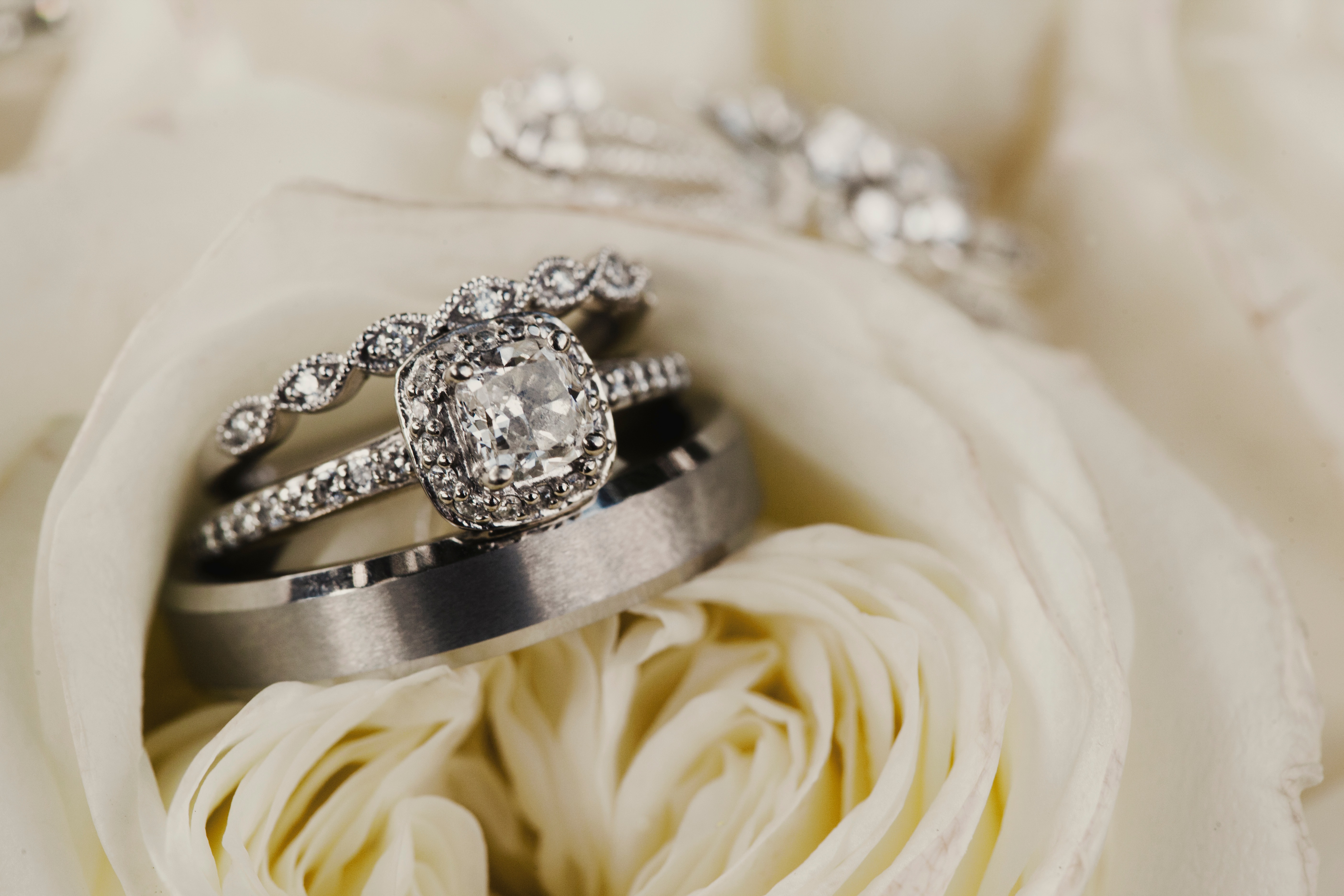 Andrew had my engagement ring made for me based off a ring I had found on Pinterest. Holly from Holly’s Jewelry in Mtn. Home, Arkansas made the ring. Both our wedding bands came from Zales. I originally wanted white peonies for my bouquet, but they aren’t in season in October. I ordered big full blown out white garden roses and was extremely upset when the florist arrived on the day of my wedding with this rose bouquet…