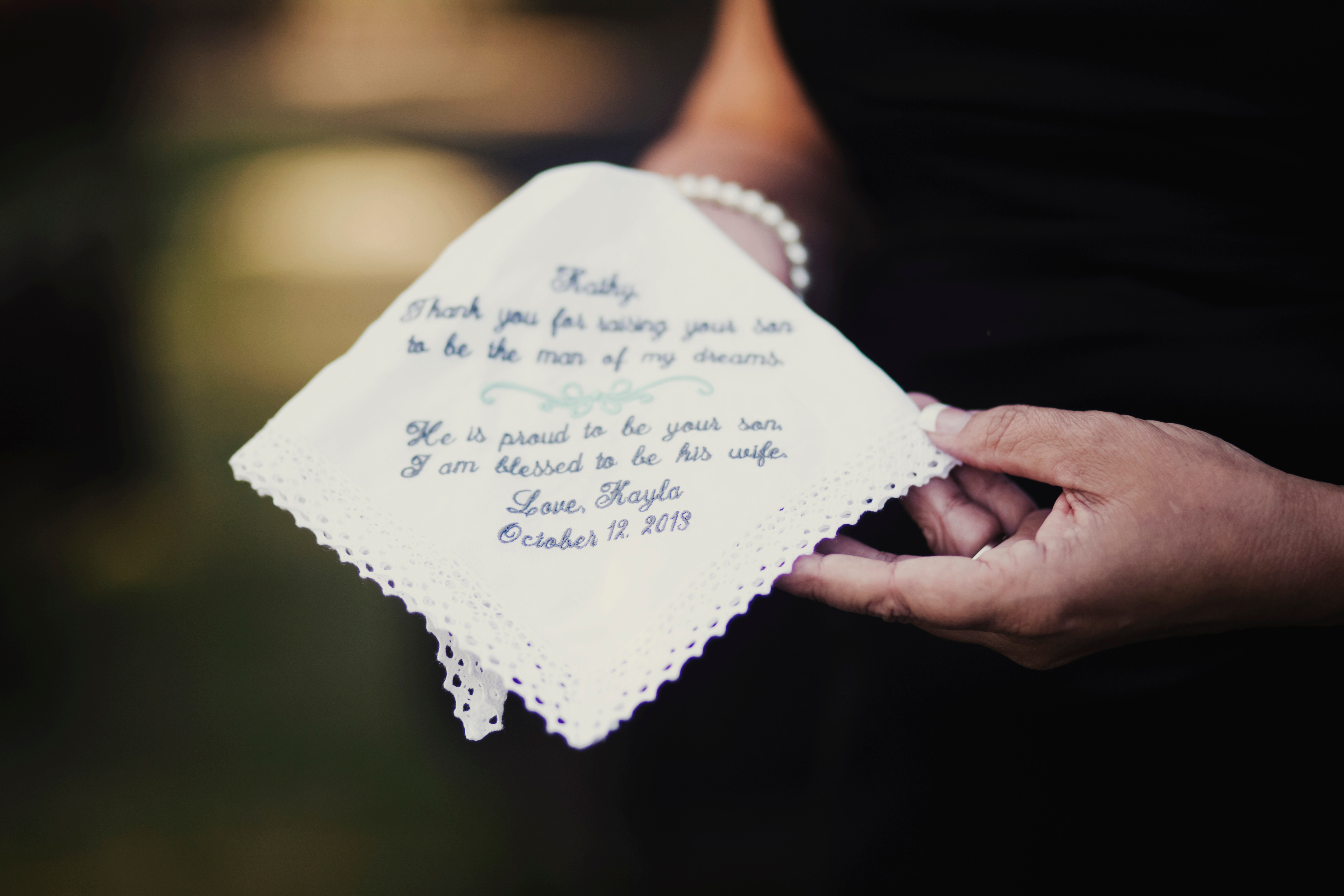 I gave my parents, grandparents, and Mother-In-Law all personalized handkerchiefs before the wedding. This was my MIL’s. It says “Thank you for raising your son to be the man of my dream. He is proud to be your son, and I am blessed to be his wife.”