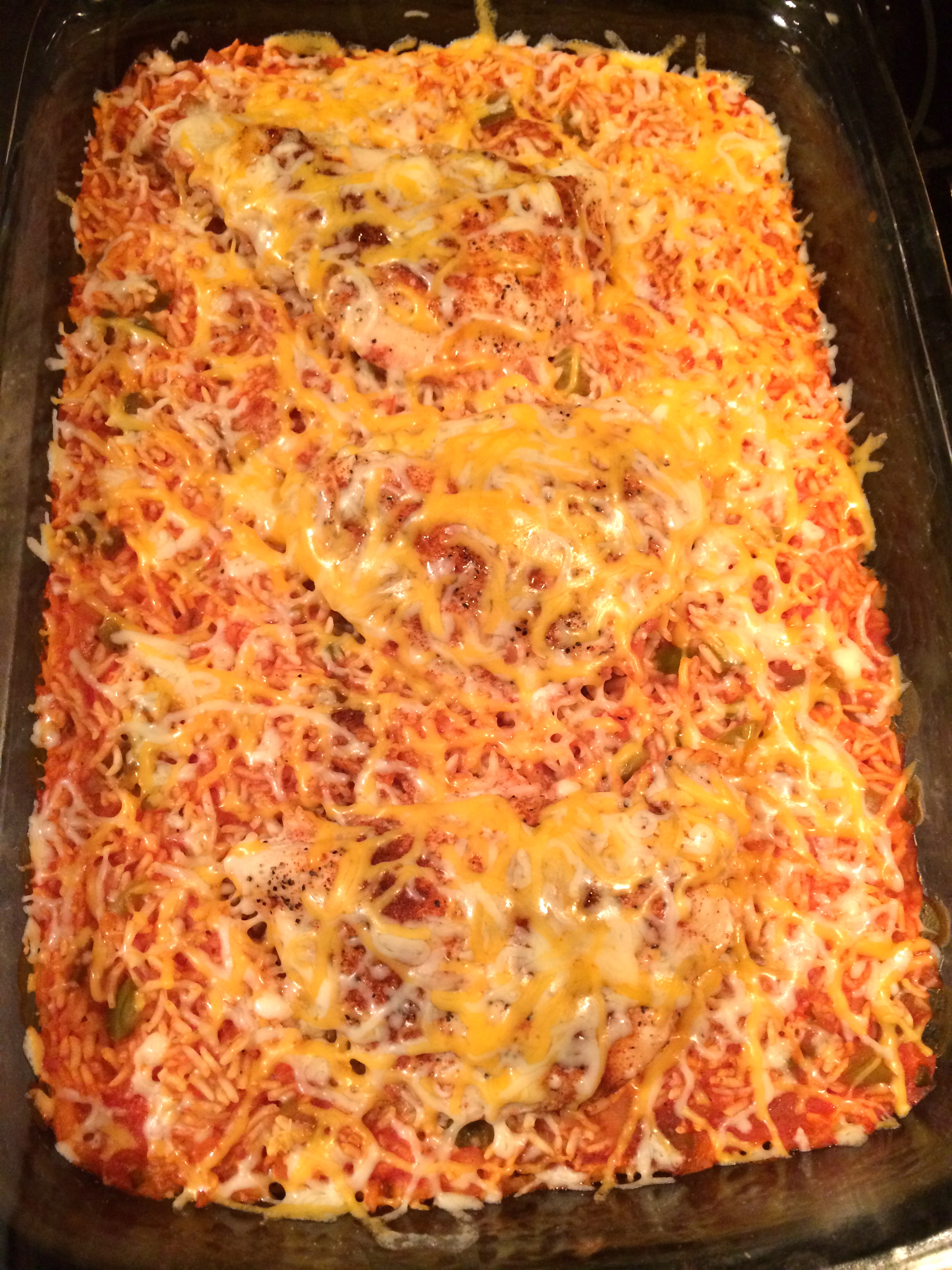 -Cover top of casserole and chicken with cheese & bake for a few more minutes until the cheese is melted.
