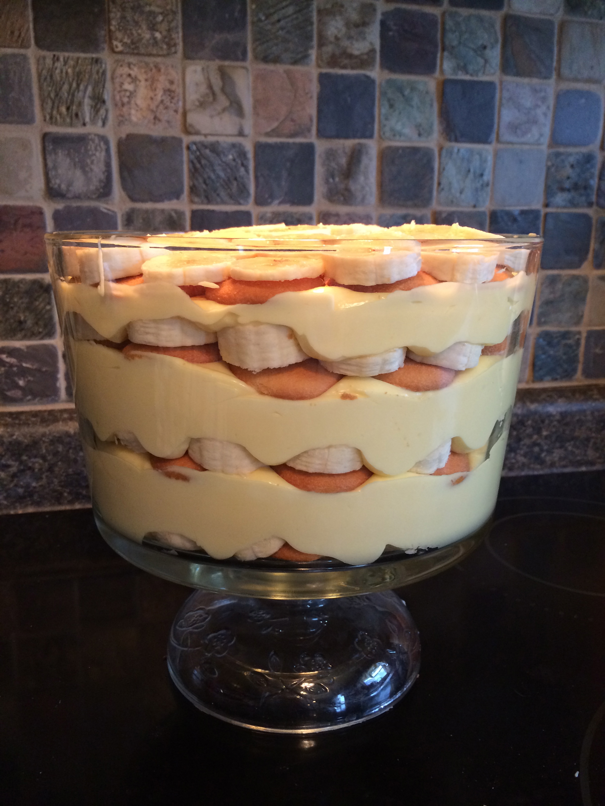 -Now you’re ready to fill your trifle bowl. When starting from the bottom of the bowl the layering should go like this: Nilla wafers, bananas, pudding mix, Nilla wafers, bananas, pudding, Nilla wafers, bananas, pudding, bananas, Nilla wafers, leftover whipped cream.