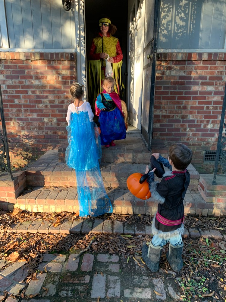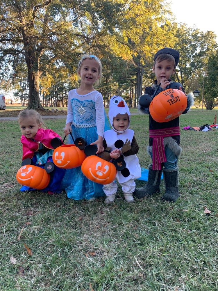 Last but certainly not least, a favorite day in the month of October, Halloween! Frozen is a huge hit at our house! Lorelei is obsessed with Elsa and Maggie Mae is equally as obsessed with Anna. Frozen was the perfect fit for our whole gang! Rhett went back and forth about whether or not he wanted to be Kristoff of Sven but I had to give the final vote when I realized it was much easier to get a Kristoff costume in his size and he was perfectly happy with that. Belle not being able to voice her opinion just yet made the absolute cutest Olaf baby I have ever seen! She was hilarious too because she loved her little Olaf head piece and wanted to wear it 24/7! It was absolutely freezing Halloween night so we only hit up a handful of houses before deciding we really were Frozen and calling it quits. The kids still ended up with buckets full of candy and had the best time!