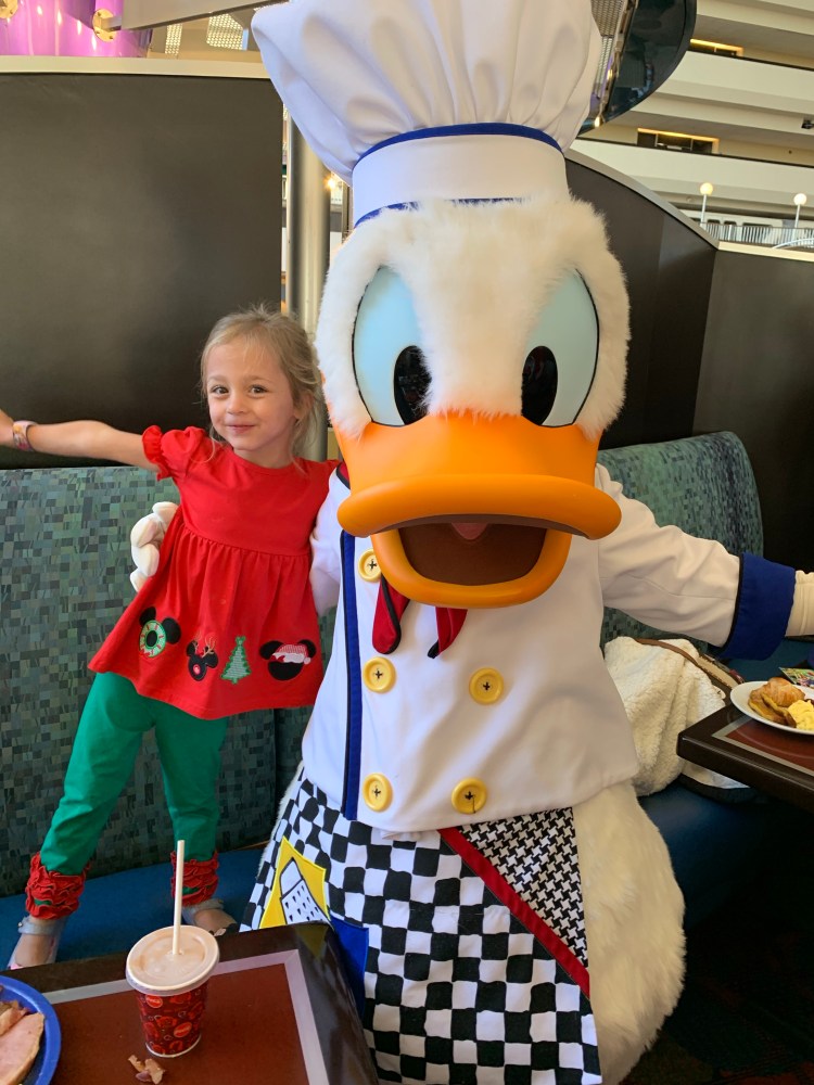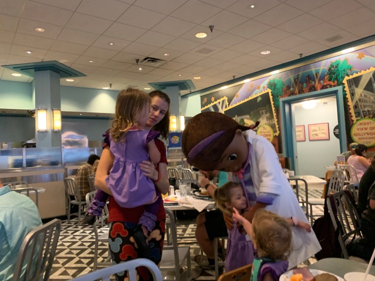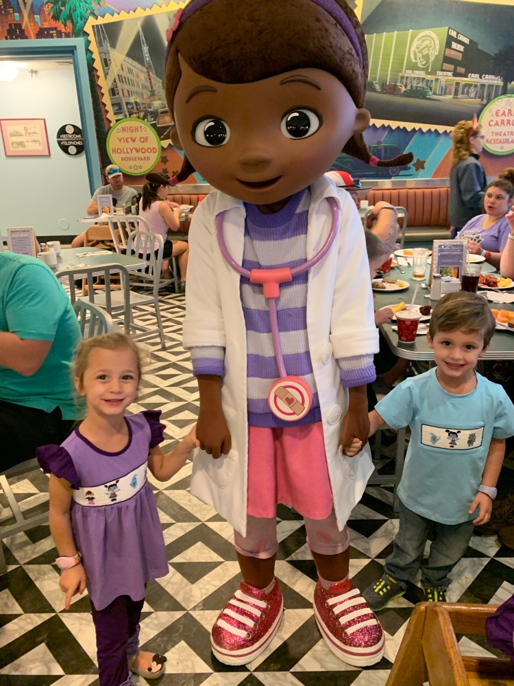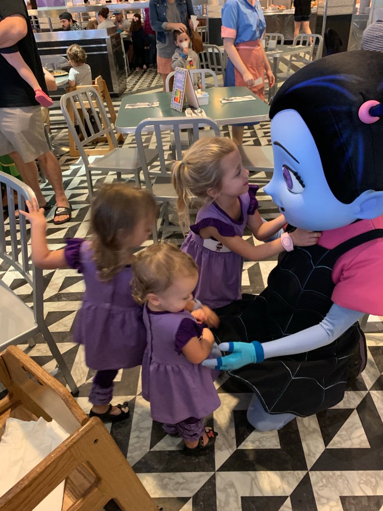 Day 4 started with 7am extra magic hours at Hollywood Studios. We rode some rides in Toy Story land before our 8am Disney Junior breakfast at Hollywood & Vine. In the last year or so the characters here have changed, ditching the old Disney Junior characters for newer ones and we are big fans of the change! Breakfast characters now include Doc McStuffins, Fancy Nancy, Vampirina, & Roadster Racer Goofy. Lorelei really loves Fancy Nancy and MM loves Vampirina, they both have magic bands of them!