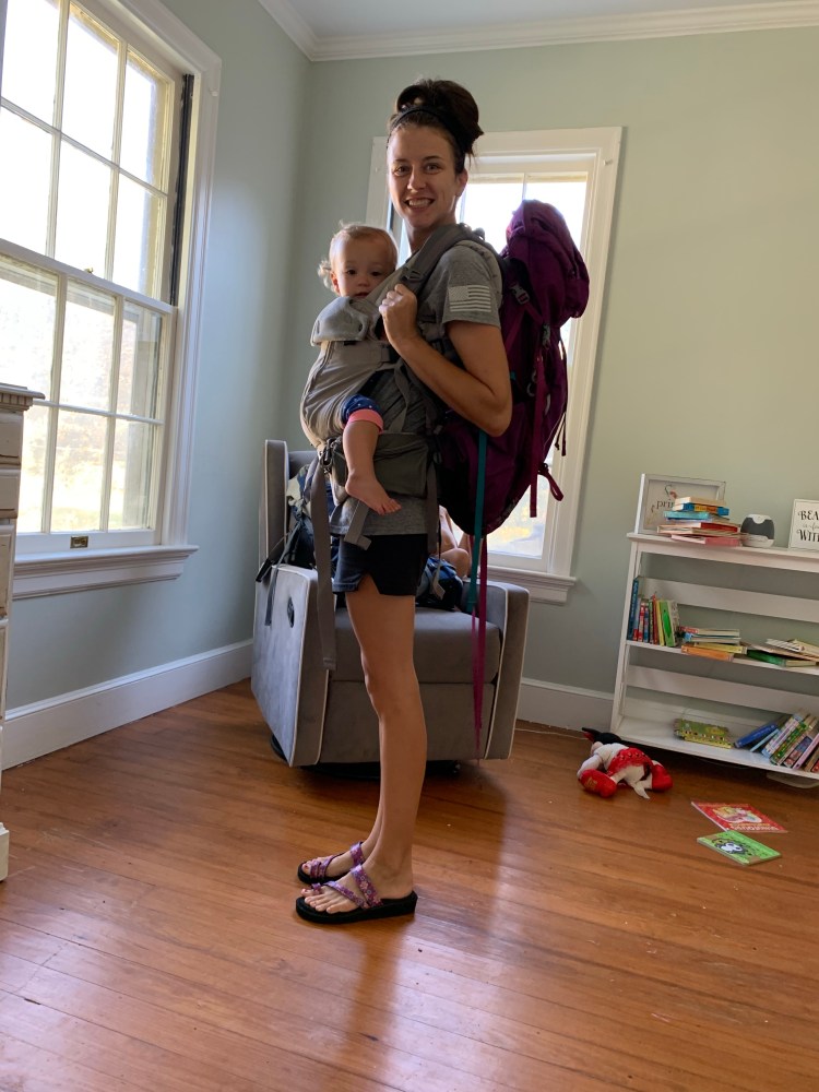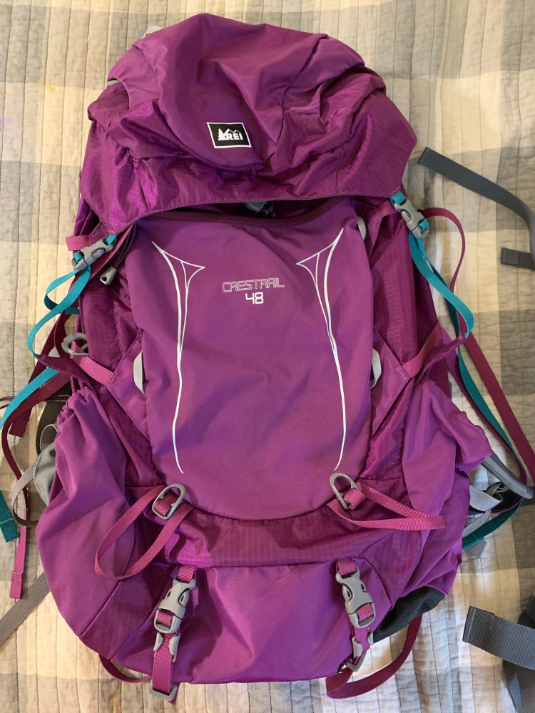 For me, Kayla, I have a 48L REI Crestrail. This pack has a huge main compartment, top compartment, and lots of side zippers and pouches. The back has a metal frame for support and structure and lots of padding. Plus it buckles around the hips and waist for weight distribution. I had no problems carrying this bag stuffed full while also baby wearing a 1 year old. For reference I’m 5’8 and 120lbs.