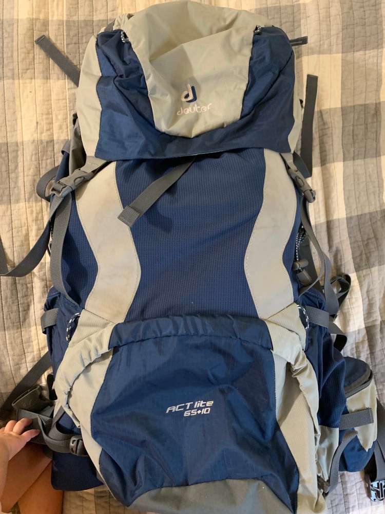 Andrew’s bag is a 75L Deuter. Obviously, it’s significantly larger than mine and he also baby wore our 2yo so he was pretty maxed out with his full bag and child attached to his body. His bag also has a steel frame for structure, 2 split large main compartments, large top compartment, lots of side pouches, padded straps and back, and buckles around the hips/waist for weight distribution. For reference Andrew is 6’3 220lbs.