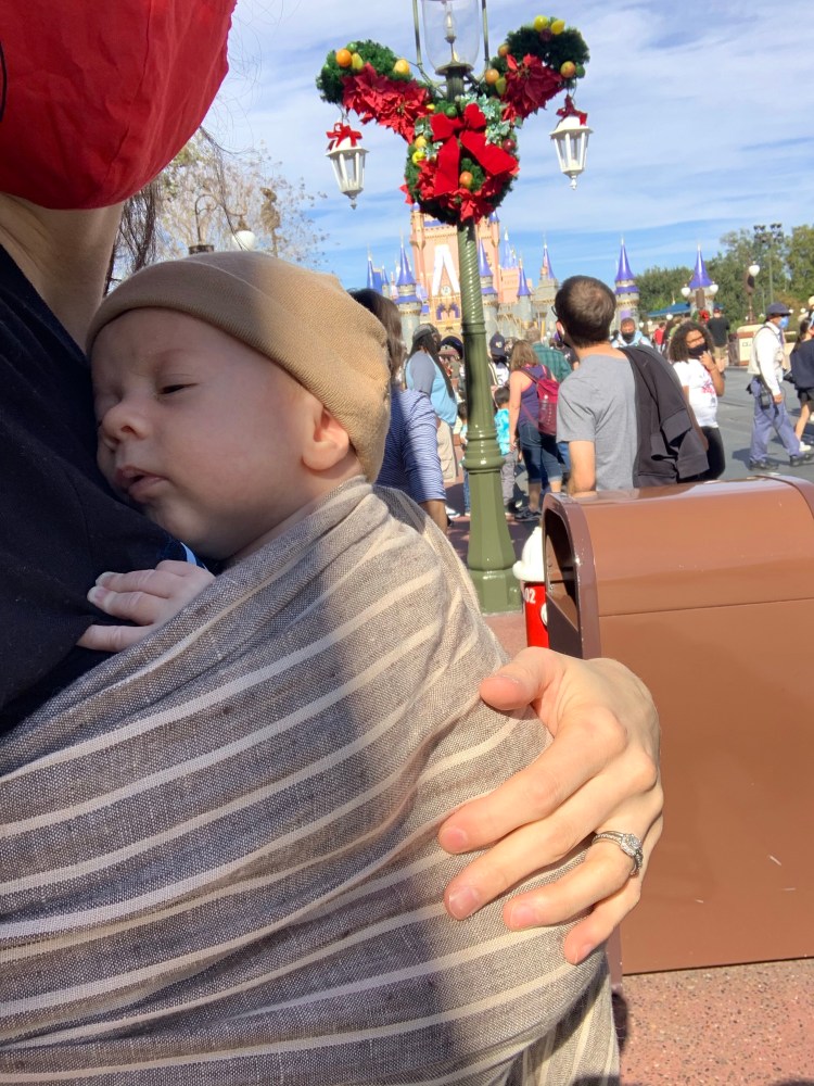 Disney World is probably one of the easiest vacations to take an infant. Every park has a baby care center that offers private nursing/pumping rooms, private bathrooms, diaper changing tables, sinks, microwaves, high chairs, and sells diapers, wipes, bottles, snacks, anything you might have forgotten for your baby. The baby care centers are very nice and extremely clean. They’re also a great place to sneak away from the heat or cold depending on the weather that day. Infants as young as a newborn can go on any ride that does not have a height requirement which is most rides across all WDW theme parks. You can also baby wear your infant in a carrier on these rides which makes them super easy to get on and off with your infant in a carrier and a toddler or two in tow!