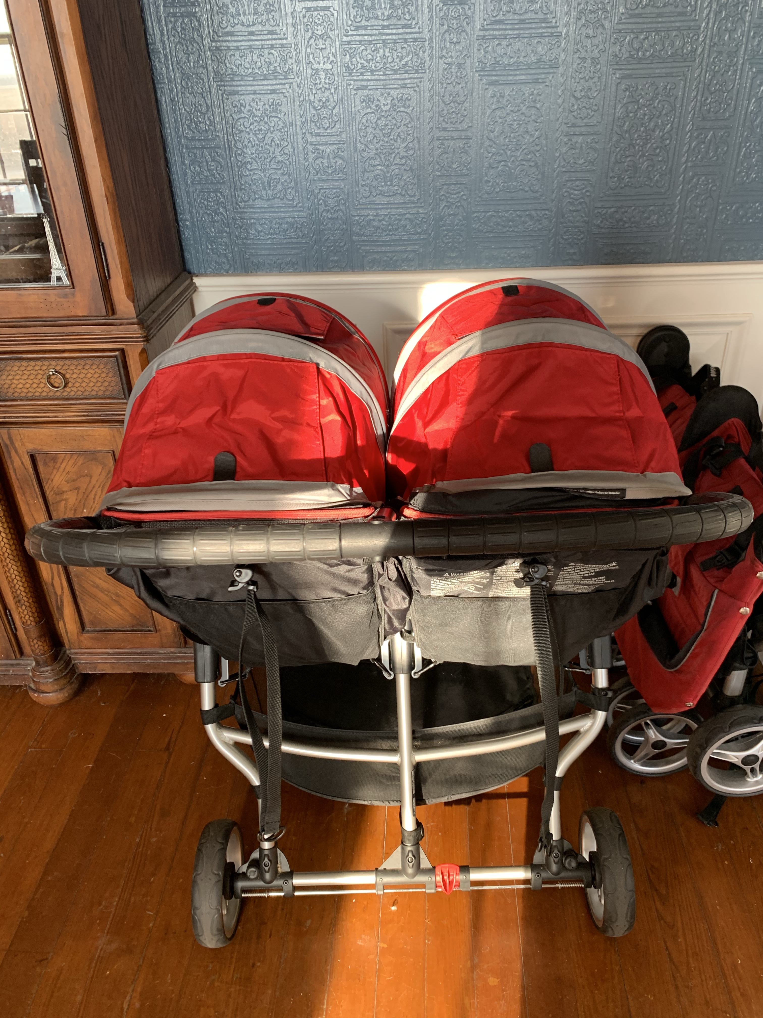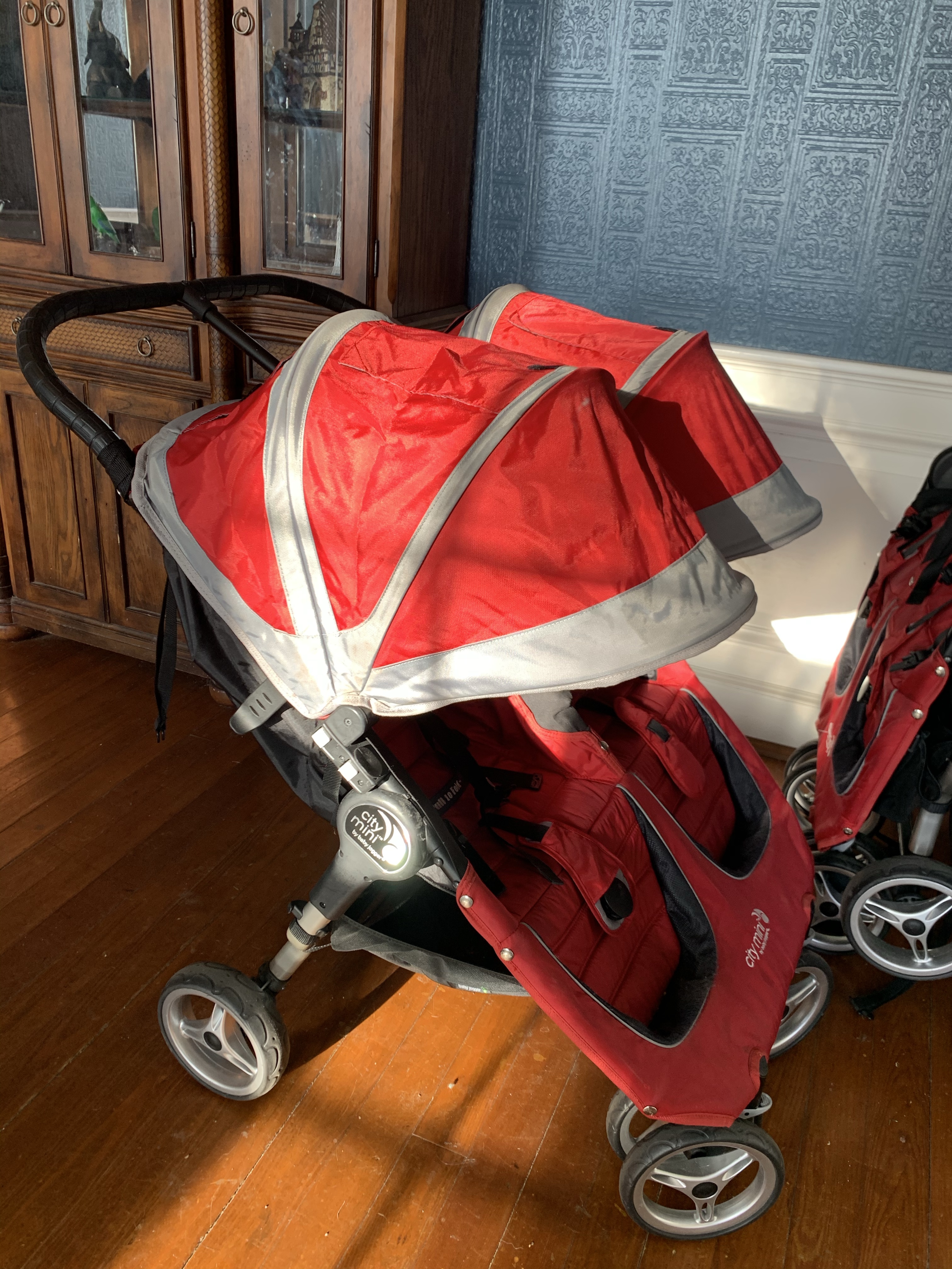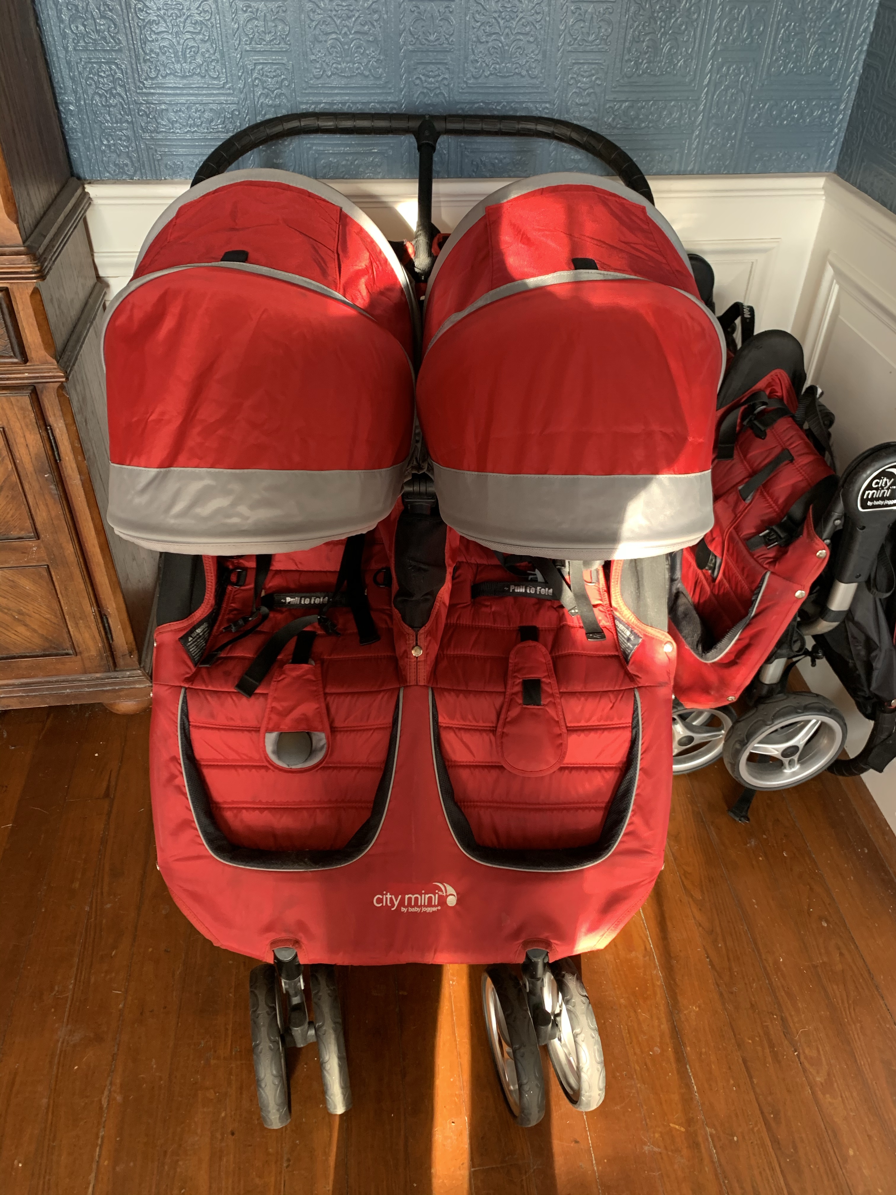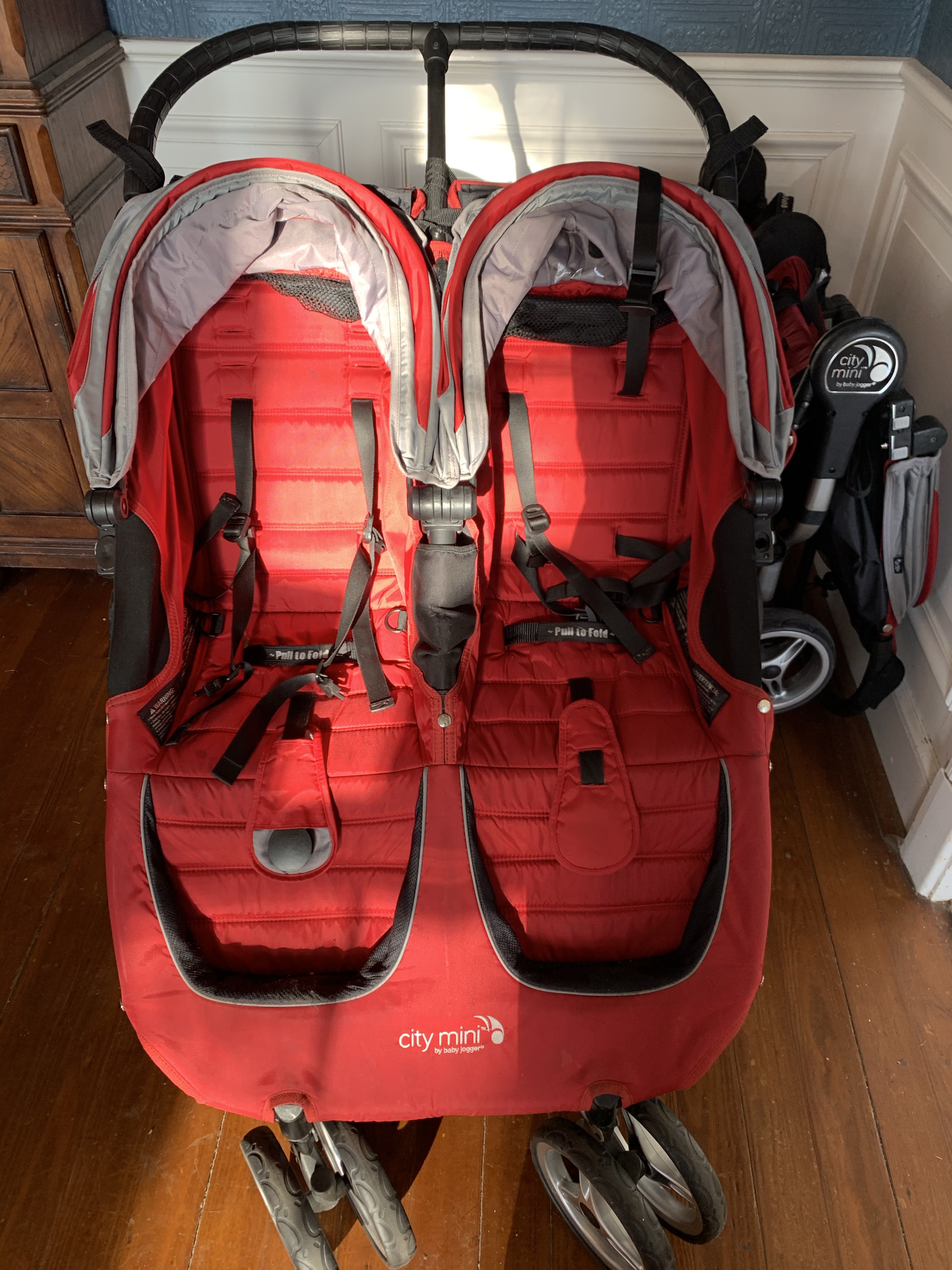 Hard to fold/unfold! Folding these beasts is work! You have to unlock the handle bar, fold the handle bar all the way in, push and pull a button and lever on both sides of the stroller at the same time and then push the entire stroller frame down and together while holding those levers and buttons down. Once folded down it’s still humongous. Unfolding is just as bad. You have to push the 2 buttons on both sides while pulling up on the 2 levers all at the same time while simultaneously pulling the stroller frame apart. If you don’t do this just right the wheels will lock up and not fold all the way out. Then you have to unlock both sides of the handle bar and pull it back out.